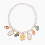 - A strand of genuine freshwater pearls is adorned with a variety rare colorful shells.