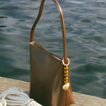 • A strand of semi-precious Tiger Eye crystal beads are adorned with a antique gold puffed heart.