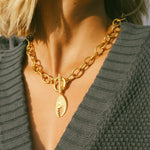 - Our antique gold-plated chain is adorned with a front-facing toggle clasp and large lobster claw pendant.
