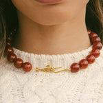 - A strand of semi-precious Agate crystal beads are adorned with an antiqued gold fish-hook toggle clasp.