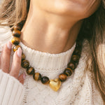 - A strand of chunky semi-precious Tiger Eye beads are adorned with a large, antique gold heart.
