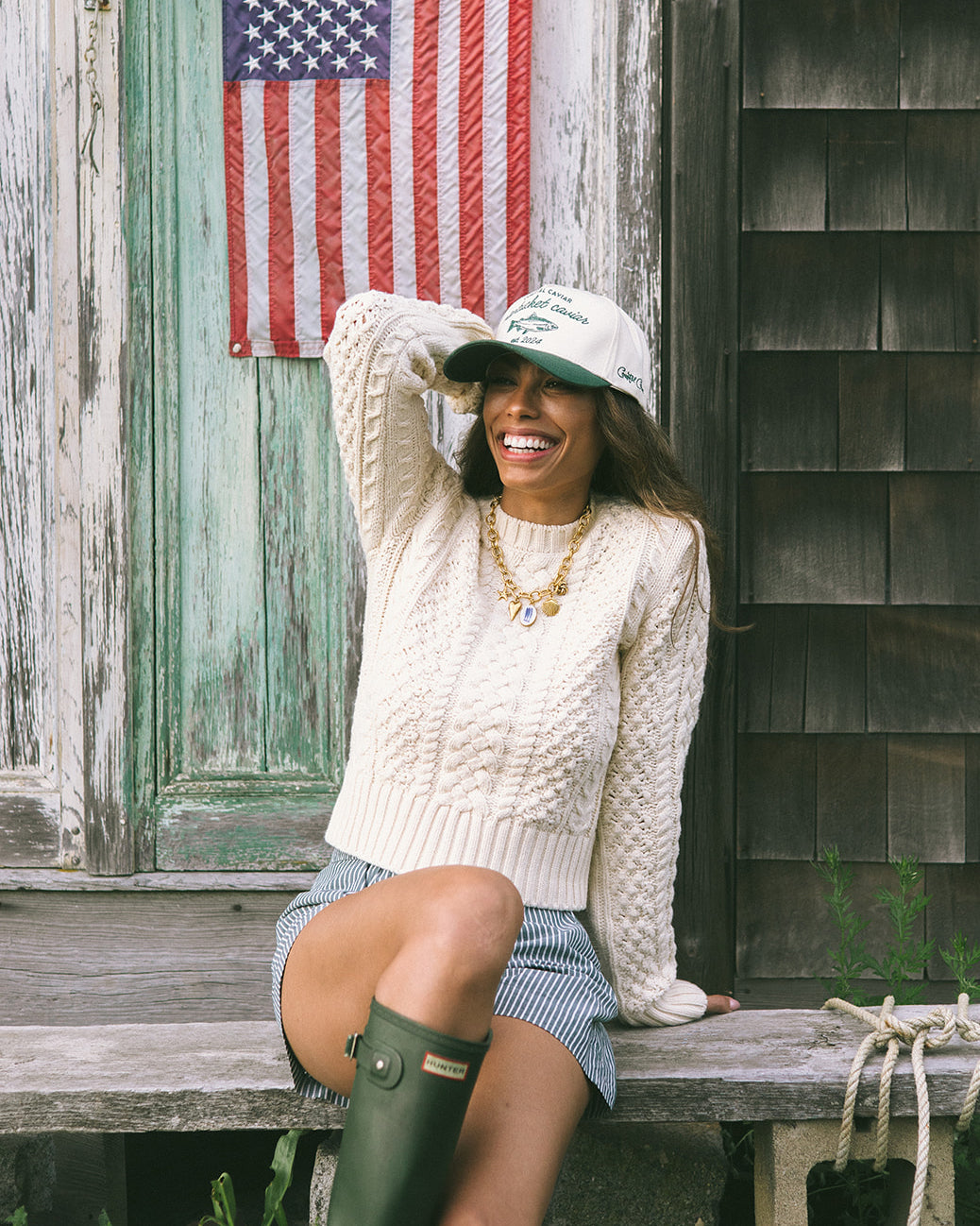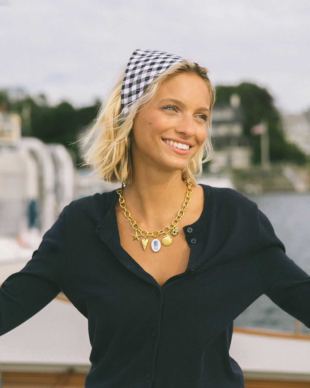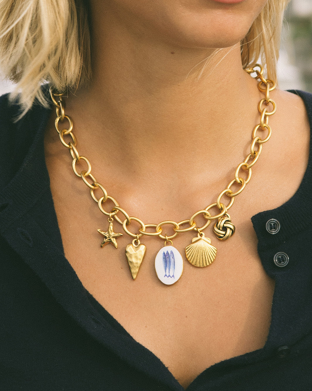 • Our antique gold-plated chain is adorned with a handcrafted clay fish pendant by Coldo Studio and a variety of antique gold-plated charms.