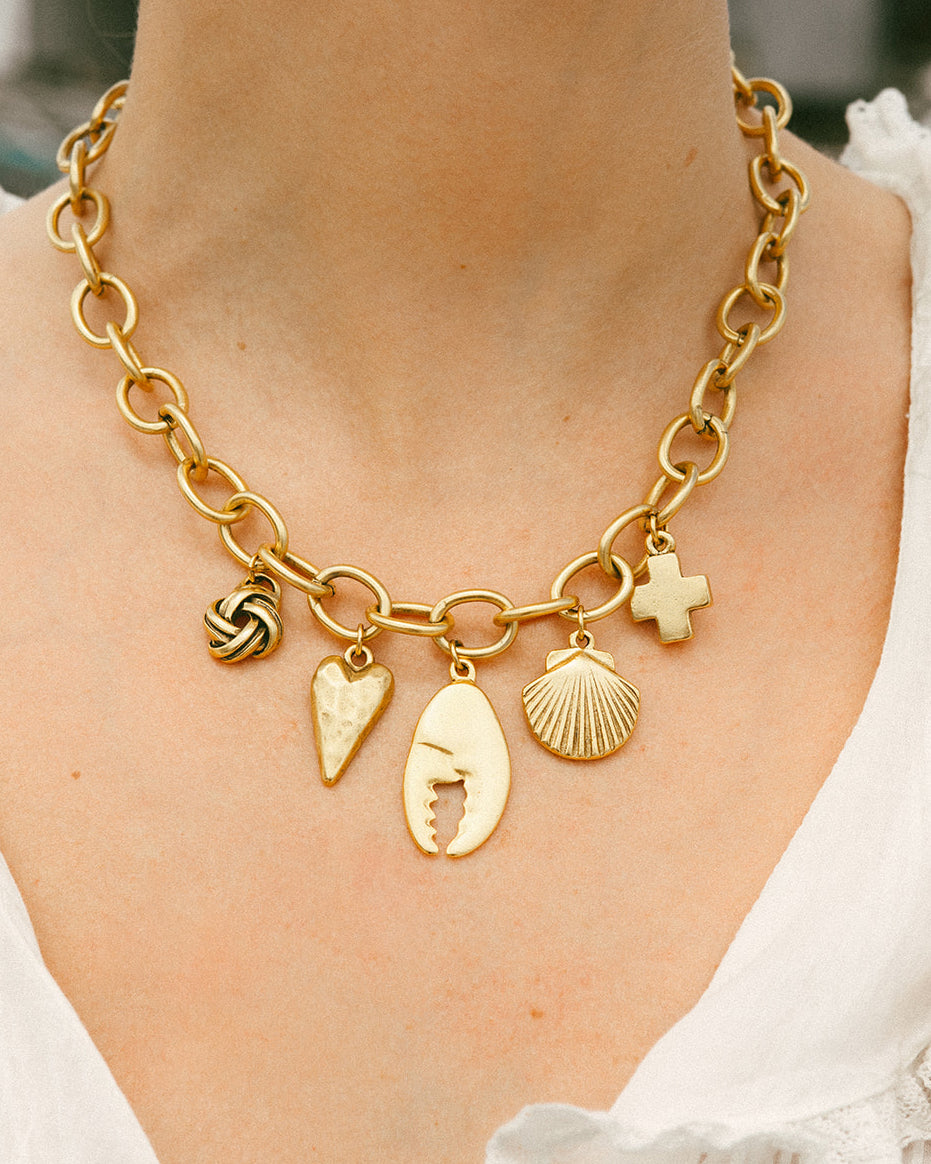 • Our antique gold-plated chain is adorned with a variety of nautical charms.
