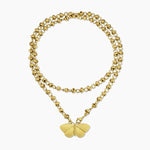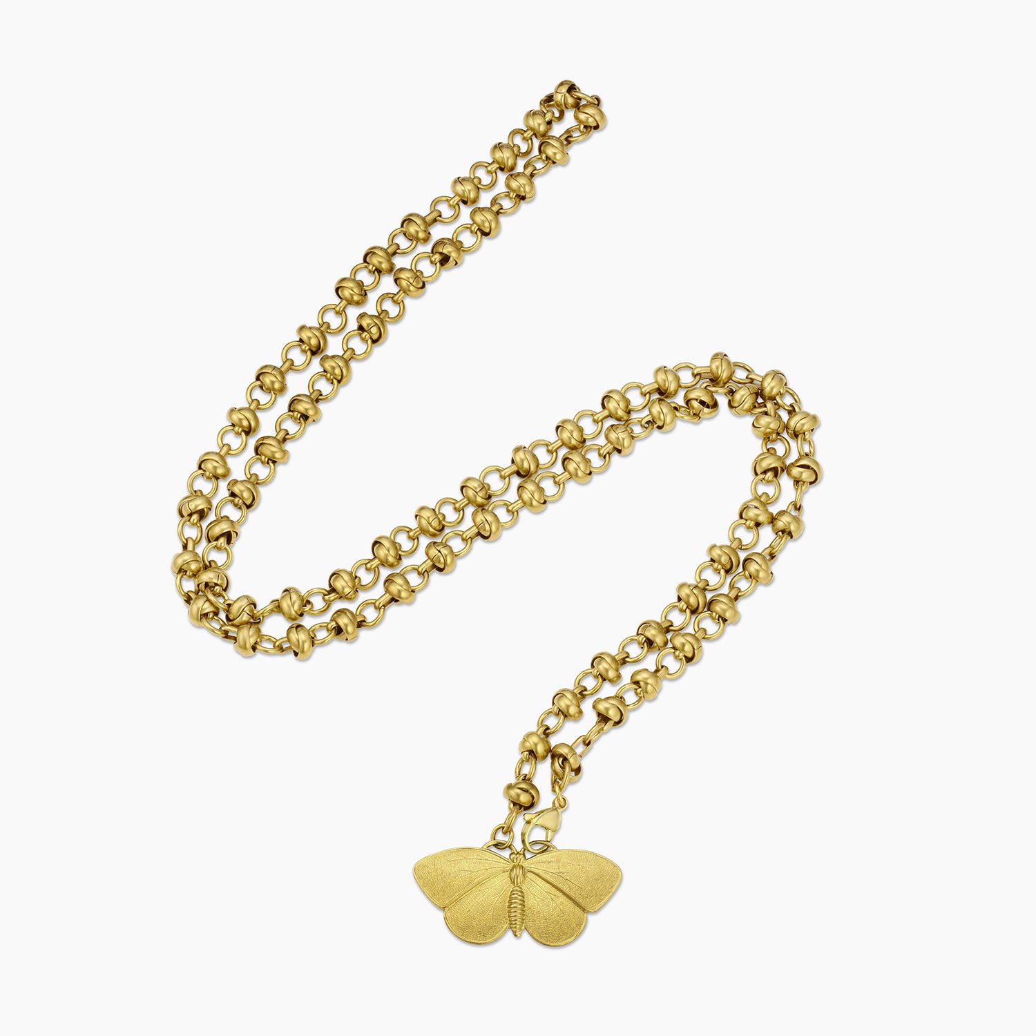 • A long, antique brass knot chain is adorned with a large brass vintage butterfly pendant.