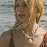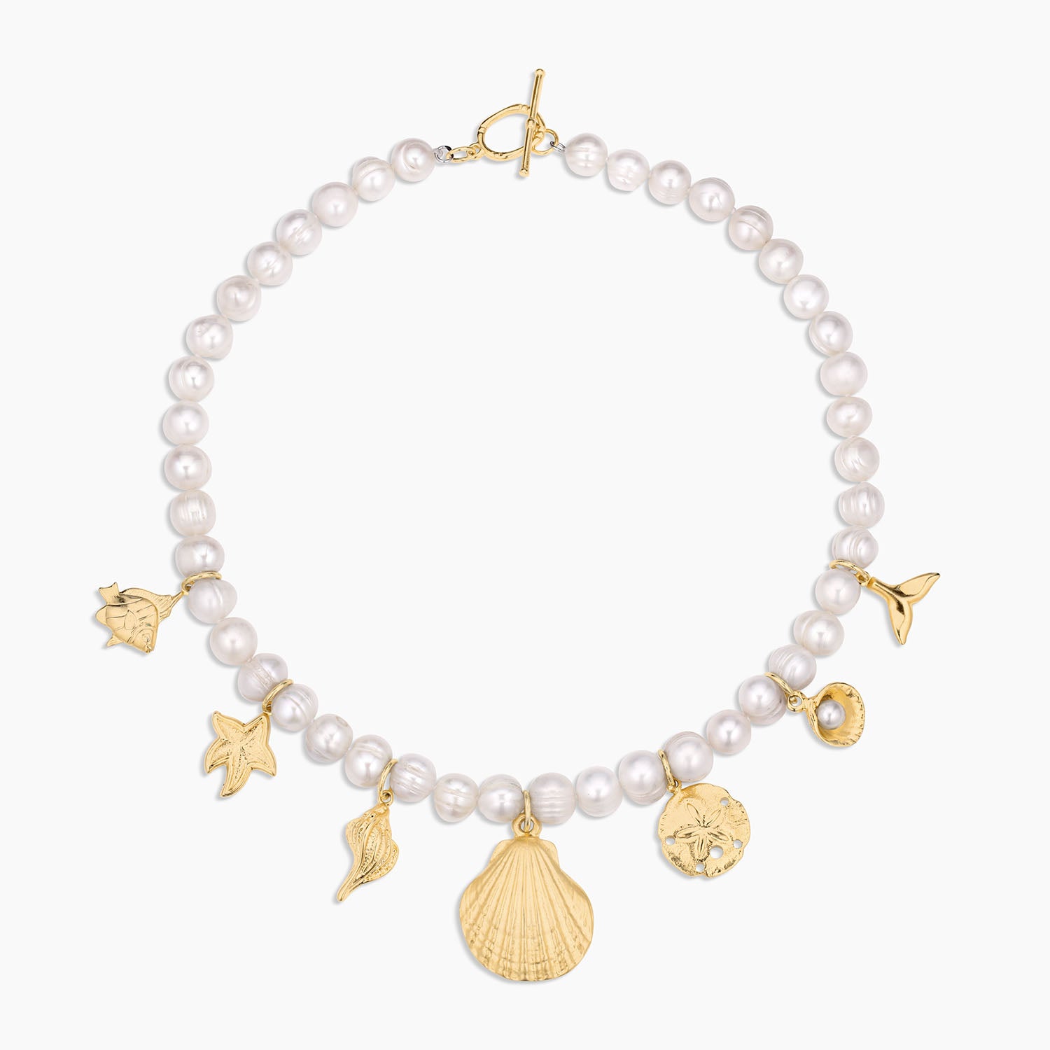 • A strand of genuine freshwater pearls is adorned with a variety of ocean-inspired gold filled charms.