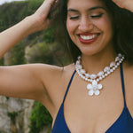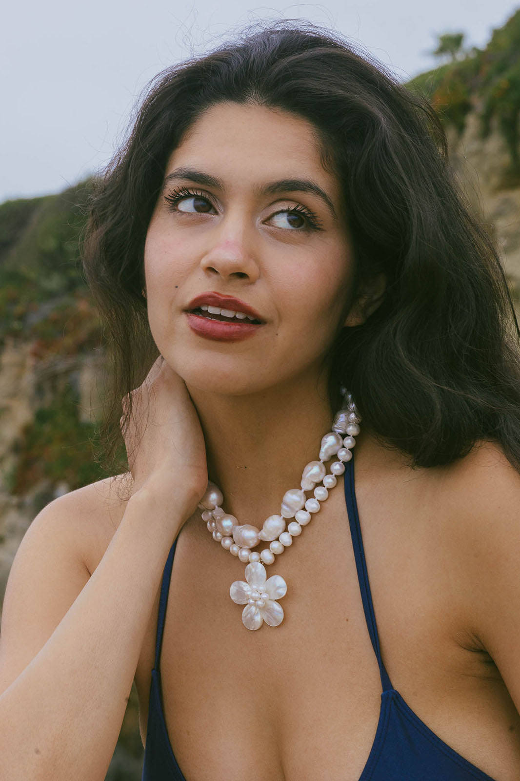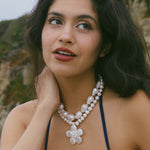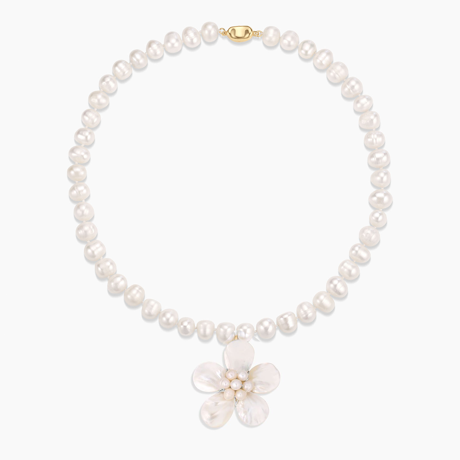 • A strand of genuine freshwater pearls is adorned with a shell flower with a pearl cluster center.