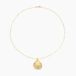 • A luxurious gold filled snake chain is adorned with a large gold-filled shell pendant.