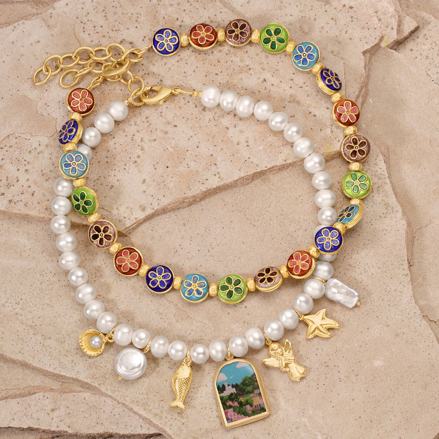 - Features a strand of colorful vintage flowers beads and antique gold spacers