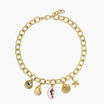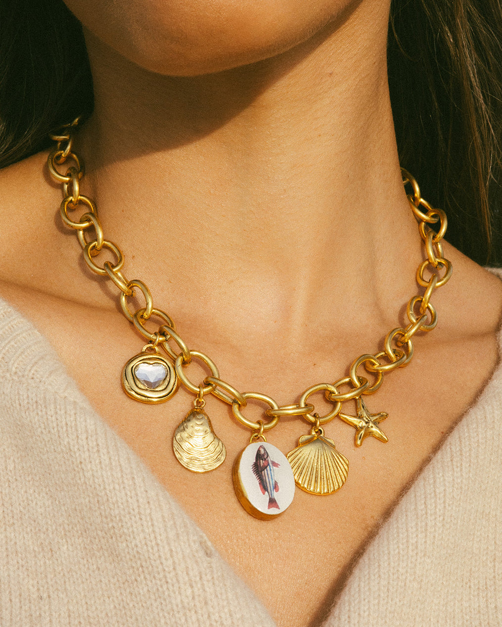 - Our antique gold-plated chain is adorned with a handcrafted clay fish pendant by Coldo Studio and a variety of antique gold-plated charms.