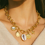 - This piece features a luxurious antique gold-plated toggle clasp.